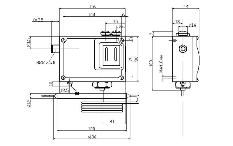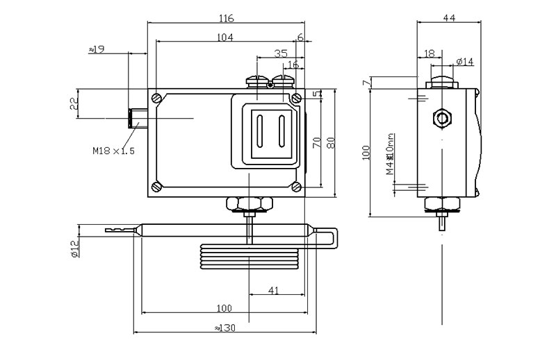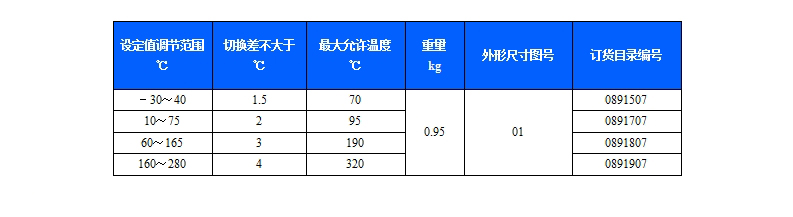 541/7TK溫度控制器采用帶毛細(xì)管溫包式傳感器,可用于流動的中性氣體和液體介質(zhì),如果介質(zhì)為腐蝕性,安裝時可選用不銹鋼溫包保護(hù)套套在銅質(zhì)溫包外(見附件)。541/7TK溫度控制器的設(shè)定值可調(diào),調(diào)節(jié)范圍-30~280℃。